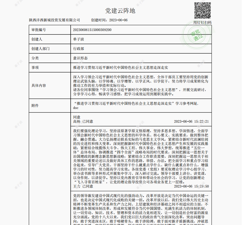 除線下面對(duì)面、點(diǎn)對(duì)點(diǎn)宣講外,灃西投資在釘釘黨建云平臺(tái)、微信群發(fā)起交流討論活動(dòng),不斷擴(kuò)大宣講知識(shí)的覆蓋面和感染力,切實(shí)做到入腦入心。