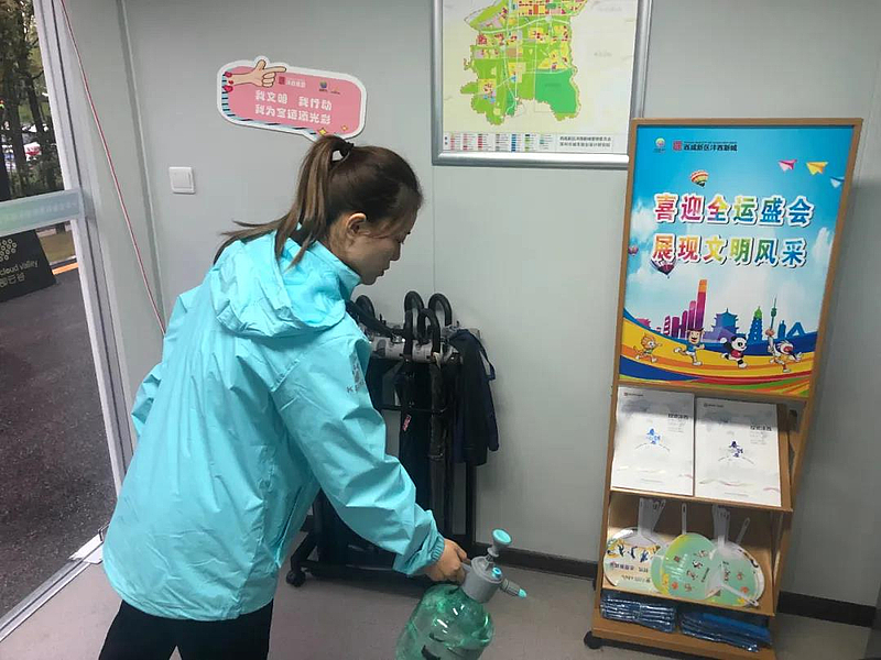 天氣炎熱時(shí),她便在崗?fù)浜脹霾瑁?yīng)給有需要的群眾,并向戶外群眾發(fā)放十四運(yùn)紀(jì)念扇;遇下雨天時(shí),她為過往群眾提供便捷雨衣,及時(shí)擦拭共享單車座椅雨水為群眾提供便利。