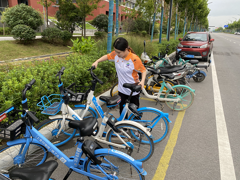 下午1點55分,志愿者屈楊夢琳剛一到崗,立即進入服務工作狀態,在志愿者崗亭內外進行打掃擦洗,對桌面、地板、展板、外墻等逐一進行清潔消殺,筑牢疫情防控安全防線。打掃完畢站點衛生后,屈楊夢琳主動走出崗亭,尋找周邊需要志愿服務的工作。她走到云谷二期南門共享單車停放區域,一手提著水桶,一手拿著抹布和消毒液,開始清潔消殺每一輛停放在點位的共享單車車座和手把,并將亂停亂放地單車擺放整齊,方便周邊群眾使用。她說:“每次崗亭門口路過很多群眾,我都會走出崗亭,看有沒有什么需要我幫助的人。”