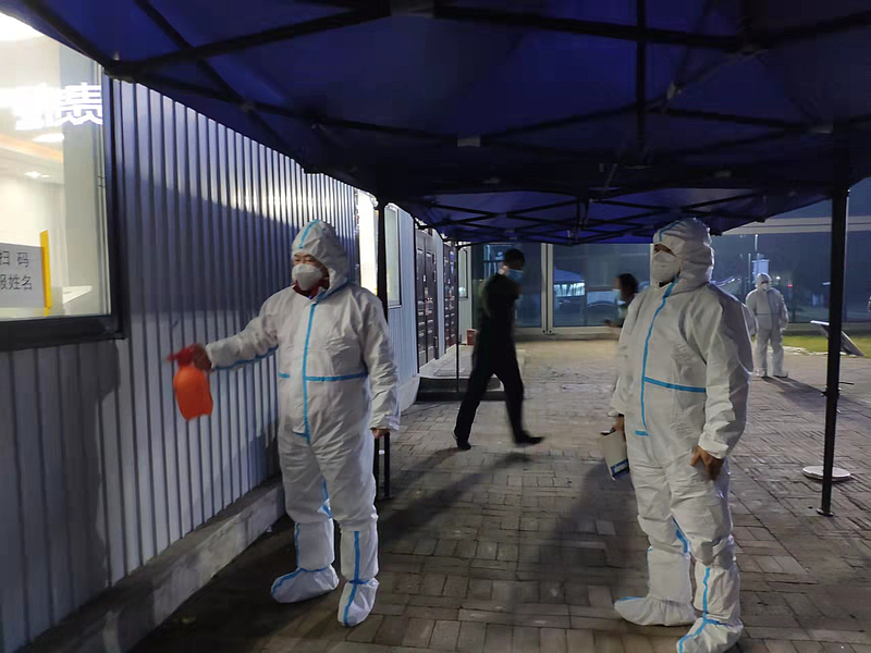 負責協調對接核酸檢測小組工作人員、檢測現場執勤及項目生活區巡查工作的張建文已經連續奮戰近20個小時了,同事們讓他去休息一下,他卻說“沒關系,還能堅持!”晚上20:00,他和同事們已完成了當天的核酸檢測工作,引導工人們有序離開檢測現場后,張建文仍然堅持著清理完畢所有設備,確保完成最后一次消殺后才放心離開。