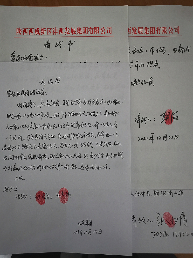 灃西發(fā)展集團黨員干部請戰(zhàn)書上錚錚誓言、鮮紅手印