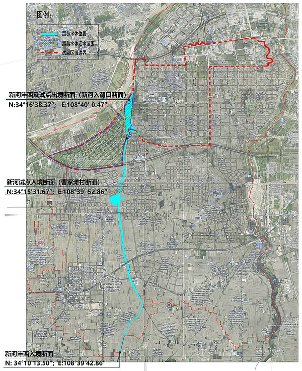 由于新河及其支流河道沿途村莊、企業(yè)較多,生活污水、企業(yè)及畜禽養(yǎng)殖廢水大量直排,河底淤泥堆積、水流較緩,加之水體自?xún)裟芰Σ睿l(fā)黑臭。2016年監(jiān)測(cè)顯示,新河整體表觀質(zhì)量較差,進(jìn)入西咸新區(qū)灃西新城前已明顯黑臭,主要超標(biāo)指標(biāo)為透明度、氨氮、ORP,等級(jí)為輕度黑臭。