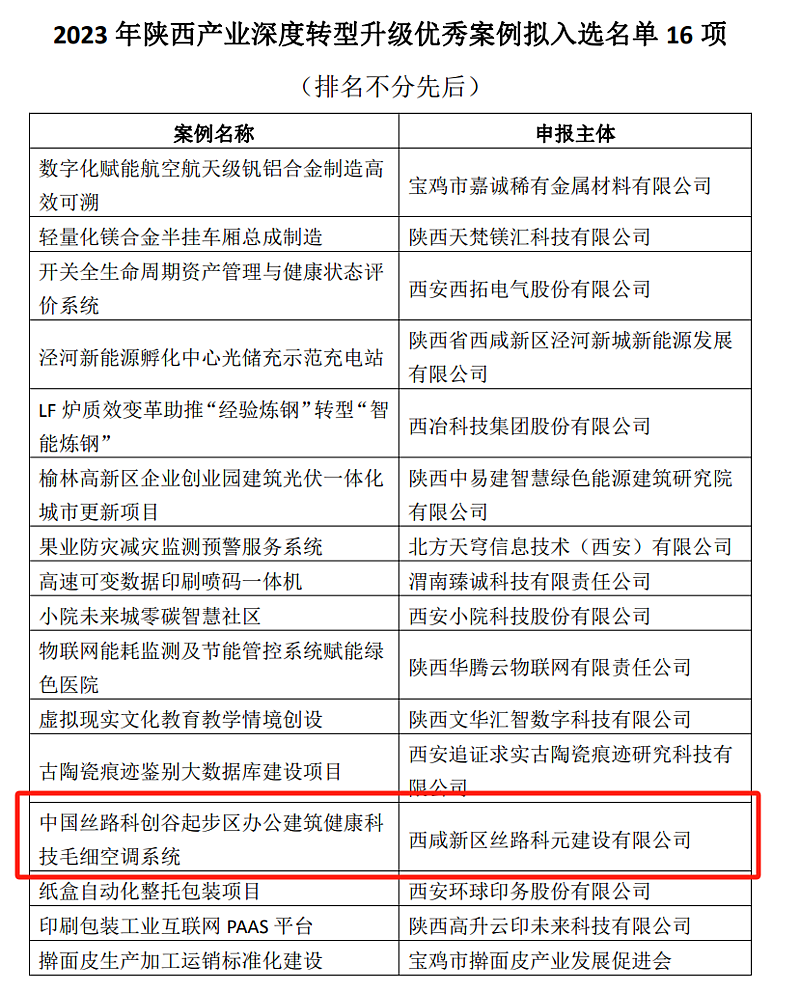 近日,2023年陜西科技創新優秀案例征集評選結果公布,西咸新區絲路科元建設有限公司申報的“秦創原生態科創島(中國絲路科創谷起步區)辦公建筑健康科技毛細空調系統”成功入選。