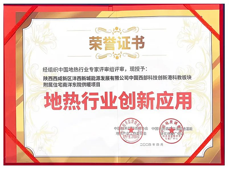 灃西能源憑借在地熱領域的卓越貢獻與創(chuàng)新應用,以中國西部科技創(chuàng)新港科教板塊南洋東院供應項目申報榮獲地熱行業(yè)“創(chuàng)新應用獎”。作為新城踐行綠色低碳發(fā)展理念、探索能源綜合利用的實踐主體,灃西能源緊抓高質量建設陜西唯一中深層地熱能試點示范區(qū)的機遇,成功構建了以中深層地熱能綜合利用為特色的智慧能源應用新模式。近年來,在中深層地熱能無干擾清潔供熱及能源利用方面取得顯著的社會、環(huán)境、經濟效益。截至目前,已在全國推廣應用中深層地熱能無干擾清潔供熱超過2600萬平方米。