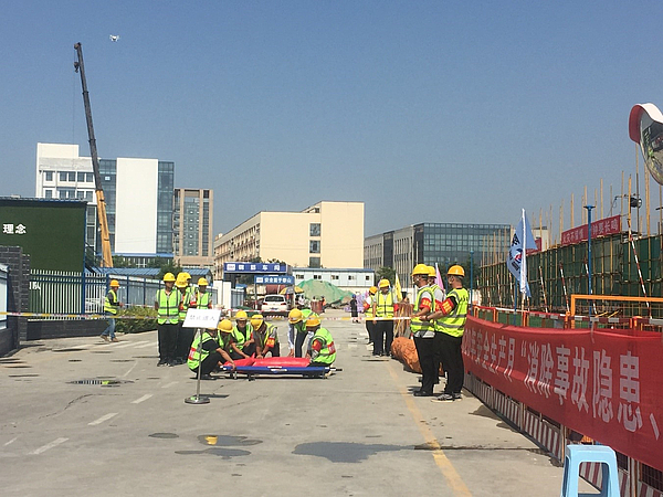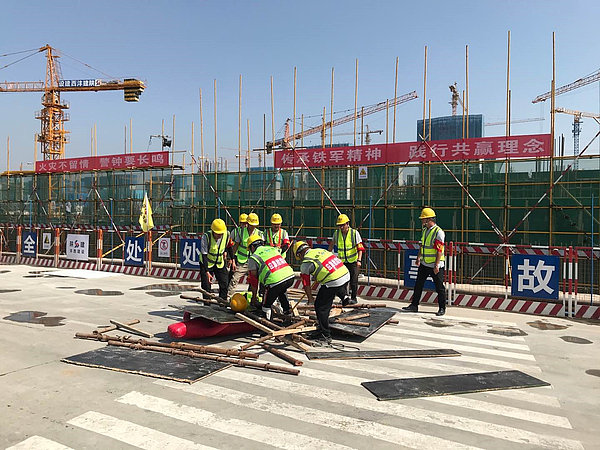 本次演練針對(duì)高支模坍塌事故和有限空間作業(yè)事故開(kāi)展應(yīng)急救援,現(xiàn)場(chǎng)分別模擬高支模架體突然發(fā)生坍塌,兩名作業(yè)人員被鋼管、模板埋壓的場(chǎng)景和由于作業(yè)人員違章操作,在未經(jīng)審批的情況下,下井作業(yè)突然暈倒的場(chǎng)景,事故發(fā)生后,現(xiàn)場(chǎng)立即啟動(dòng)應(yīng)急預(yù)案,在應(yīng)急指揮部統(tǒng)一調(diào)度下,各應(yīng)急救援組各司其職,分頭行動(dòng)開(kāi)展應(yīng)急救援工作。經(jīng)過(guò)緊張救援,遇險(xiǎn)人員被救出,并送往醫(yī)院進(jìn)一步治療。現(xiàn)場(chǎng)救援人員隨即全部撤離,各項(xiàng)演練任務(wù)順利完成。