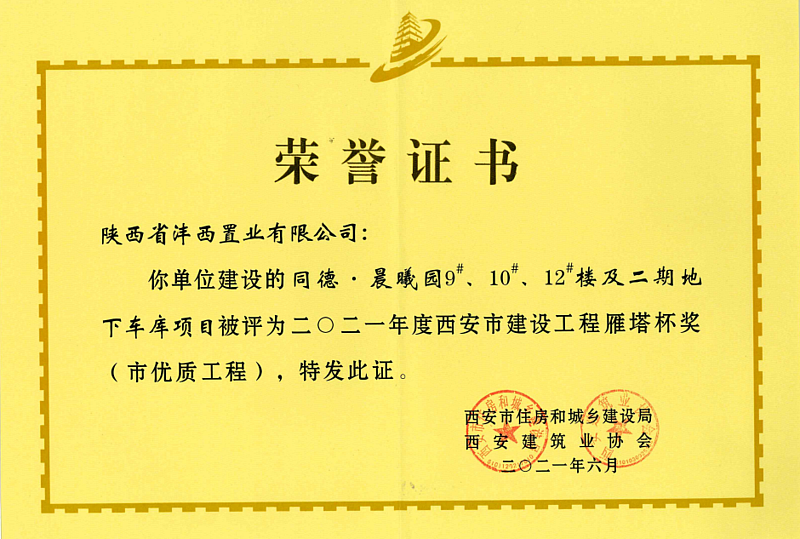 同德·晨曦園9#、10#、12#樓及地下車庫項目先后通過陜西省文明工地、陜西省建筑業綠色施工示范工程、陜西省新技術應用示范工程、陜西省優質結構工程評選;先后榮獲西安市建設工程“雁塔杯”、陜西省優質工程“長安杯”獎等多項榮譽。