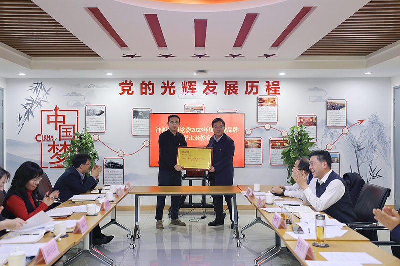 會(huì)上,郭廷喜宣讀了《關(guān)于表彰灃西集團(tuán)2023年度黨建品牌評(píng)比獲獎(jiǎng)單位的通報(bào)》,MIC黨支部、行政部黨支部、西咸信息產(chǎn)業(yè)園黨支部分別榮獲集團(tuán)2023年度黨建品牌評(píng)比前三名。隨后,集團(tuán)領(lǐng)導(dǎo)向獲獎(jiǎng)單位頒發(fā)獎(jiǎng)牌。