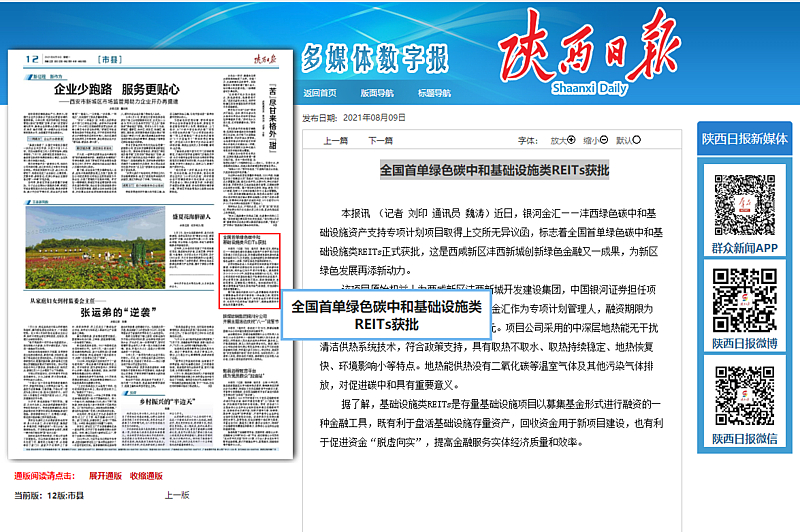 陜西日報——全國首單綠色碳中和基礎設施類REITs獲批